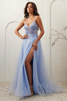 Light Blue Beaded Bodice A-Line Tulle Gown with High Slit