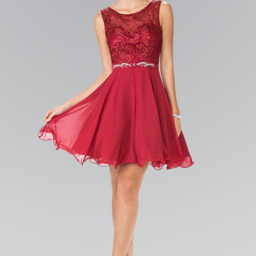 Lace Bodice A-Line Short Dress Jeweled Waist Band GLGS2314