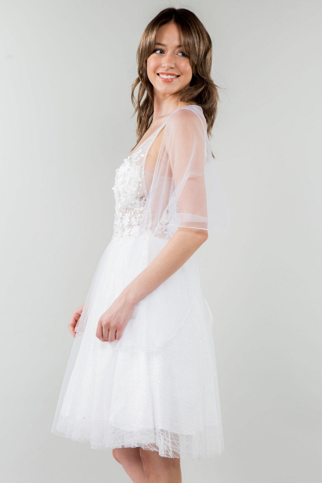 Sparkly and perfect youthful look, opt for this lovely glitter embellished mesh short dress! Corset boning creates such an elegant look, yet sheer sides, sheer back, and deep illusion V-neck makes you smokin' hot.