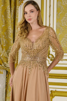 3 4 sleeve embellished v neckline mesh bodice chiffon skirt a line dress with back keyhole GLGL3796