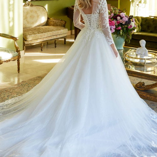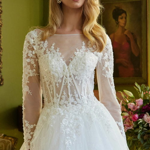 Grace your special day in this ethereal illusion long sleeve wedding gown, where timeless romance meets couture detailing. The sheer bodice features delicate floral embroidery over a corset-inspired design, giving the illusion of structure while maintaining softness and femininity. Long mesh sleeves adorned with lace appliquΓ© offer a regal touch, while the voluminous A-line tulle skirt flows beautifully with every step. The floral lace edging at the hem completes the gown with a fairytale flourish, perfect for the bride who dreams of elegance, sophistication, and a little bit of magic.