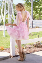 Fit and Flare Dress with Deep V Pleated Neckline, Flowy Chiffon Multi-Layered Skirt, Adorned by Detachable Bow-Tie , and Zipper Back