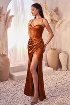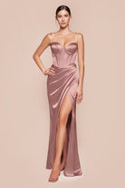 Make a stunning entrance in our Fitted Satin Bustier Draped Gown. This elegant dress is crafted from a smooth, luxurious satin that drapes beautifully over your figure. The structured bustier top provides a flattering fit, while the artful draping adds a touch of sophistication. Perfect for formal events, weddings, and galas where you want a classic, yet modern, look.