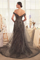 Make a dazzling entrance in this Dark Silver Off-Shoulder Sequin Gown, a show-stopping creation for your most glamorous nights. Designed with intricate silver sequin embroidery that shimmers with every step, this dress features an elegant off-the-shoulder neckline and a sculpted silhouette that highlights your curves. The dramatic high slit adds allure, while the flowing tulle overlay brings a touch of ethereal sophistication. Ideal for formal galas, red carpet events, and luxury weddings.