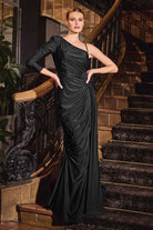 Step into timeless sophistication with our Elegant One-Shoulder Draped Satin Gown. Designed for the modern muse, this striking dress features a bold asymmetrical neckline with one-shoulder detailing, enhanced by shimmering embellishments across the bodice for a subtle sparkle. The luxuriously draped satin fabric flatters your curves, while the high side slit adds a daring edge. Perfect for formal events, galas, or red-carpet moments, this gown is available in classic Black, rich Emerald, and regal Navy.