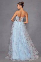 Dreamy, delicate, and designed to dazzle — this light blue floral corset gown is everything you need for your next special event. Featuring a structured illusion corset bodice with exposed boning and a romantic sweetheart neckline, this dress flatters your shape while adding modern edge. The soft tulle overlay is detailed with whimsical floral prints that float as you move, and the thigh-high slit gives the airy A-line silhouette a bold, confident touch.