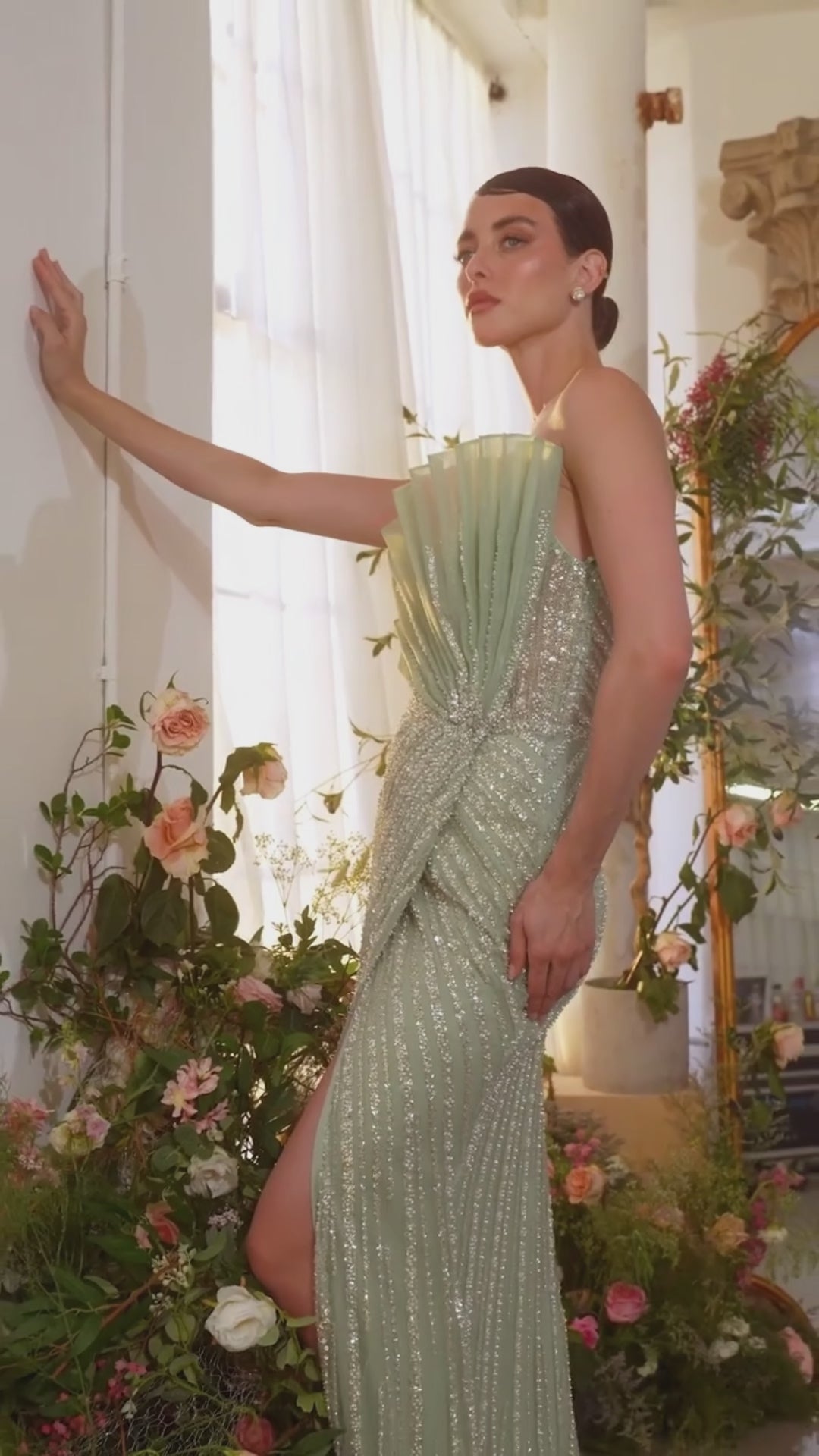 Step into the spotlight with this dazzling strapless sage green evening gown, meticulously adorned with shimmering sequins that accentuate its elegant silhouette. The sleek, form-fitting design flatters your figure, while the high side slit adds a touch of sultry sophistication. The pleated bodice enhances the bust, drawing attention to your natural curves. Perfect for formal occasions, red carpet events, proms, and galas, this gown promises to leave a lasting impression.