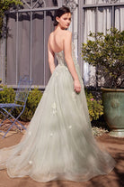 Sage Green Strapless Floral Embroidered Tulle Gown with High Slit
