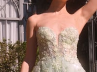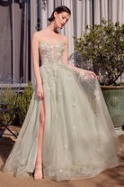 Enchant in this Sage Green Strapless Floral Embroidered Tulle Gown, crafted for the romantic soul. The delicate sheer bodice is adorned with intricate floral embroidery and shimmering sequins, flowing into a dreamy A-line tulle skirt. Featuring a flattering sweetheart neckline and a daring thigh-high slit, this gown effortlessly blends elegance with allure. Perfect for prom, garden weddings, or any evening affair where making a graceful statement is key.