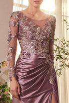 Embroidered Long Sleeve Gown with Slit | Formal Draped Satin Evening Dress CDA1403