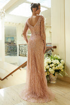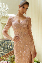 Make a dazzling statement in this navy sequin evening gown that blends timeless elegance with modern flair. Featuring a sweetheart neckline and sheer 3/4 length sleeves, this fitted dress is adorned with shimmering beadwork that cascades down the silhouette like falling stars. The high side slit adds a touch of sultry sophistication while allowing ease of movement.