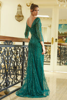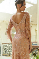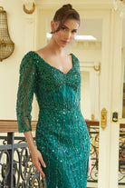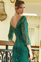 Navy Sequin Evening Gown with 3/4 Sleeves and High Slit
