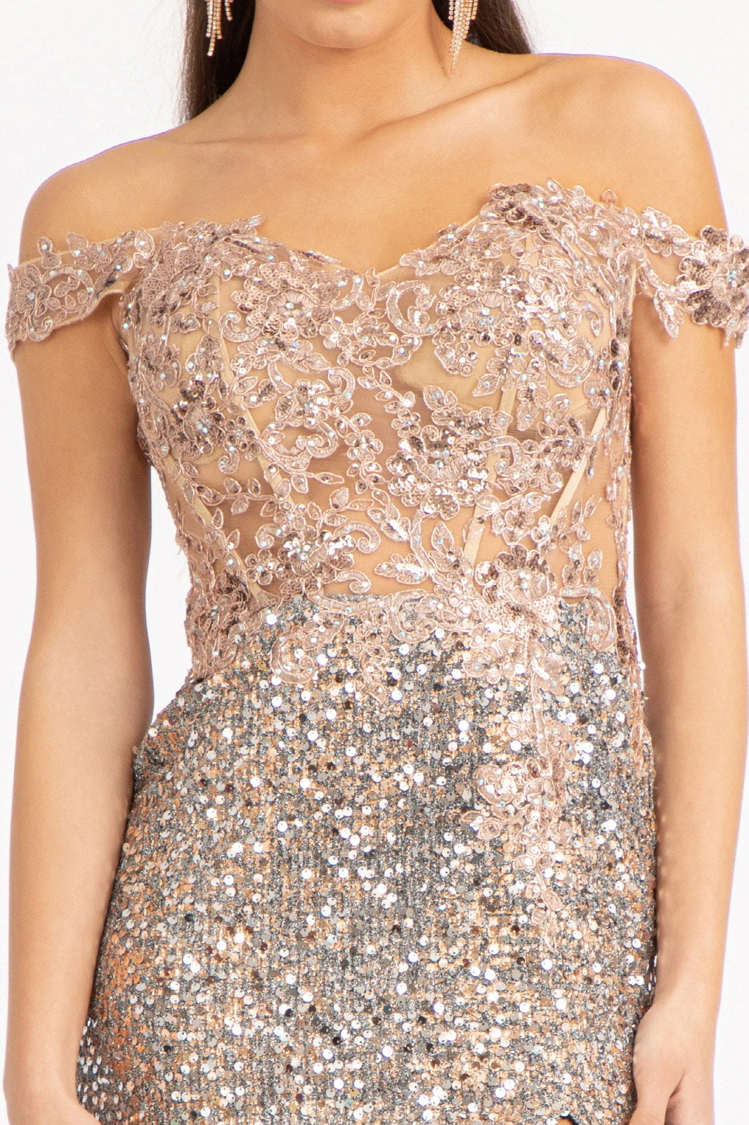 Sheer Bodice Cut-Away Shoulder Lace-Up Back Sequin Prom Dress Leg Slit GLGL3024