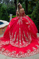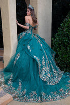 Embrace royalty in this show-stopping emerald green quinceañera ball gown adorned with rich gold embroidery and 3D floral appliqués. Designed to impress from every angle, this gown features an off-the-shoulder neckline, beaded corset bodice, and a full, sweeping skirt made of glitter-infused tulle that sparkles under every light.