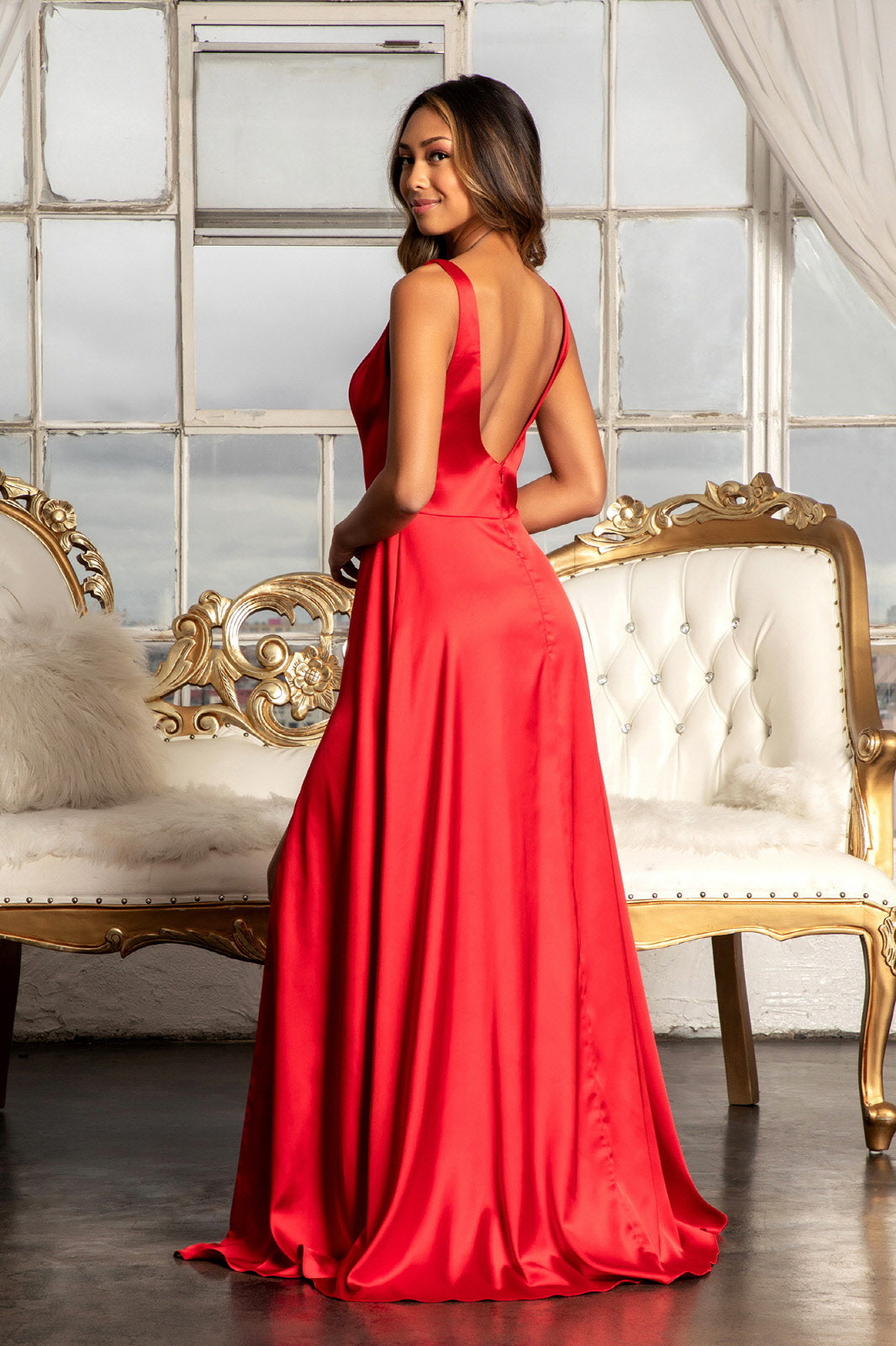Satin V-Neck Sheer Side A-Line Long Dress GLGL1992