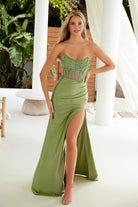 THIS ELEGANT PROM DRESS FEATURES A STRAIGHT, STRAPLESS NECKLINE THAT CREATES A SLEEK, MODERN SILHOUETTE. THE SHEER, BONED WAISTLINE IS BEAUTIFULLY ADORNED WITH A SPARKLING ARRAY OF SILVER STONES, ADDING A TOUCH OF GLAMOUR. THE V-SHAPED BACK INCLUDES A DISCREET ZIPPER CLOSURE, WHILE A THIGH-HIGH SLIT ALLOWS FOR EASY MOVEMENT AND A DRAMATIC FLAIR. THE LONG, FLOWING SKIRT COMPLETES THE STUNNING, RED-CARPET-READY LOOK. - SEMI-STRETCH!