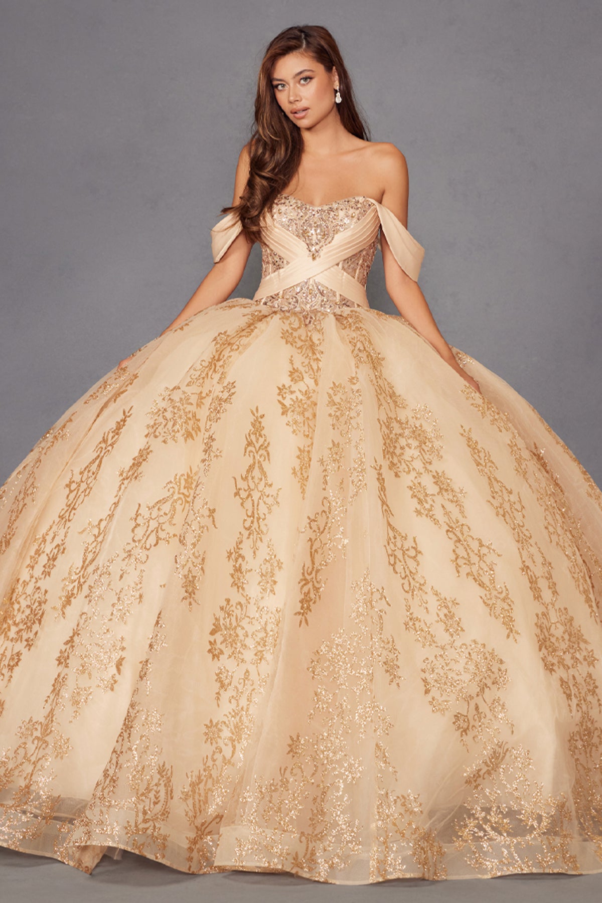 This quinceaΓ±era dress is a breathtaking masterpiece, designed to make any young woman feel like royalty on her special day. The dress features a voluminous, full-length skirt that gracefully flares out from the waist, creating a dramatic and elegant silhouette. The skirt is adorned with intricate embroidery and embellishments that cascade down in a luxurious pattern, reminiscent of regal attire. The corset is fitted and showcases a sweetheart neckline, beautifully accentuated by the same embroidery that enhances its opulent appearance. The off-the-shoulder sleeves add a touch of grace and sophistication, perfectly complementing the overall design. The sheer overlay of the dress adds an ethereal quality, making it look as if it belongs in a fairy tale. Every detail of this dress, from the delicate embroidery to the sweeping skirt, is crafted with precision and care, ensuring that the wearer will shine with elegance and beauty.