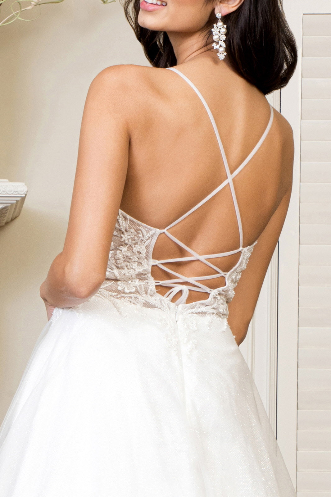 Time to focus on POV from back! This glitter mesh A-line dress has wild lace up open back for special day and night, and also features beautiful embroidery.