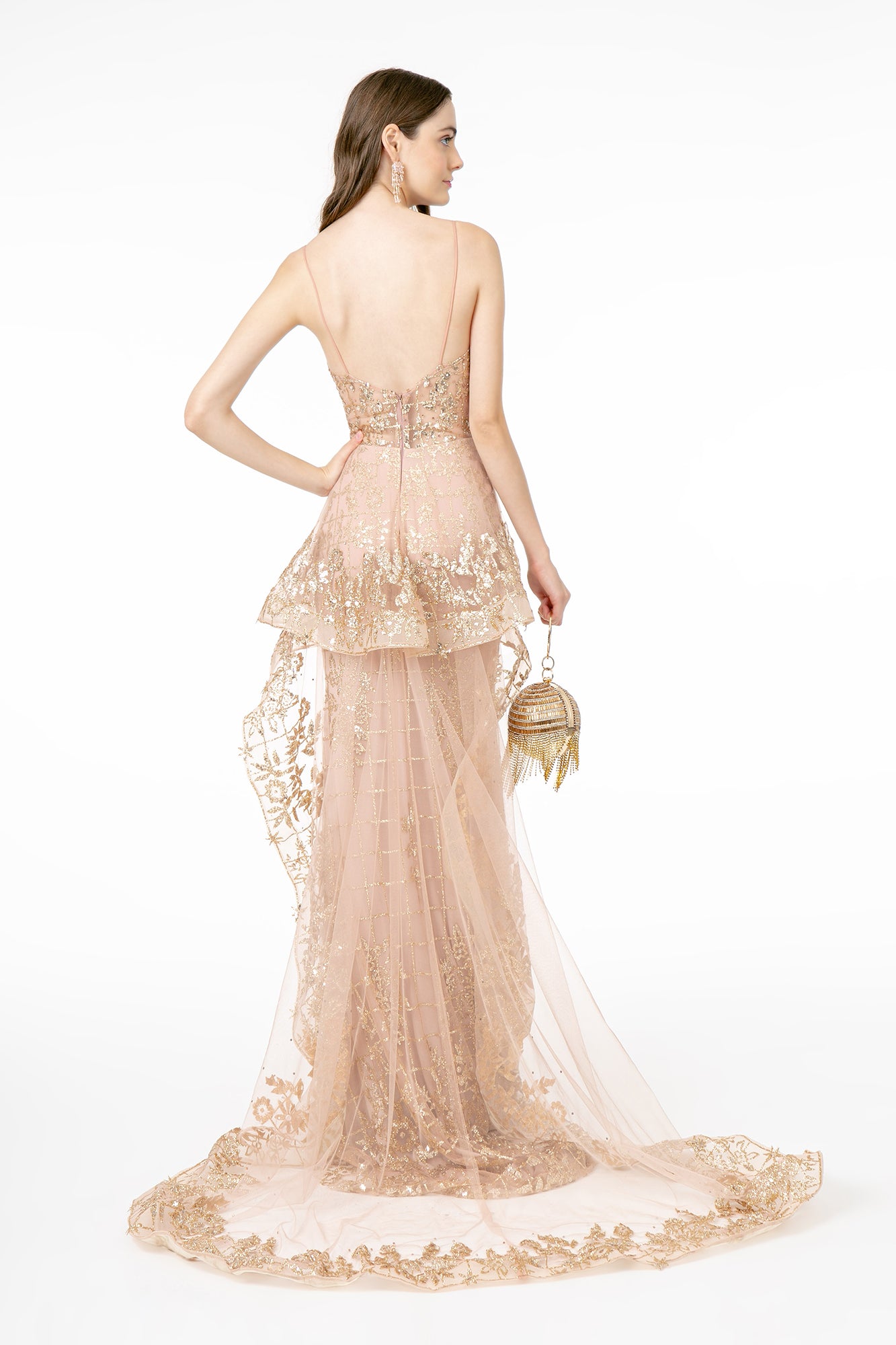 Sheer Bodice and Back Long Dress Accented with Rhinestone Over Floral Pattern Lace GLGL2108