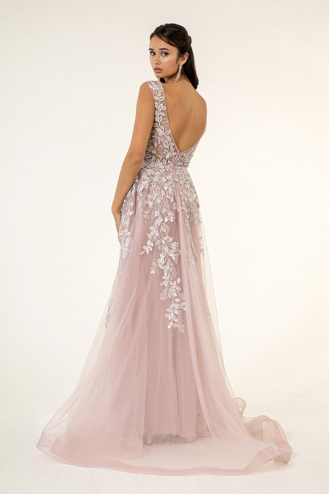 V-Neck Floral Embroidery Embellished Bodice Glitter Mesh Long Dress - Mask Not Included GLGL1917