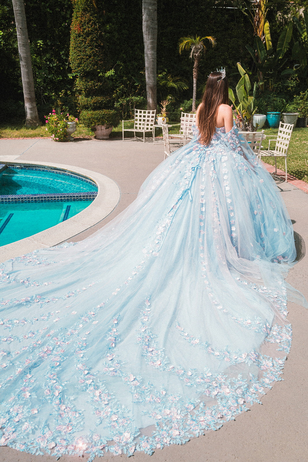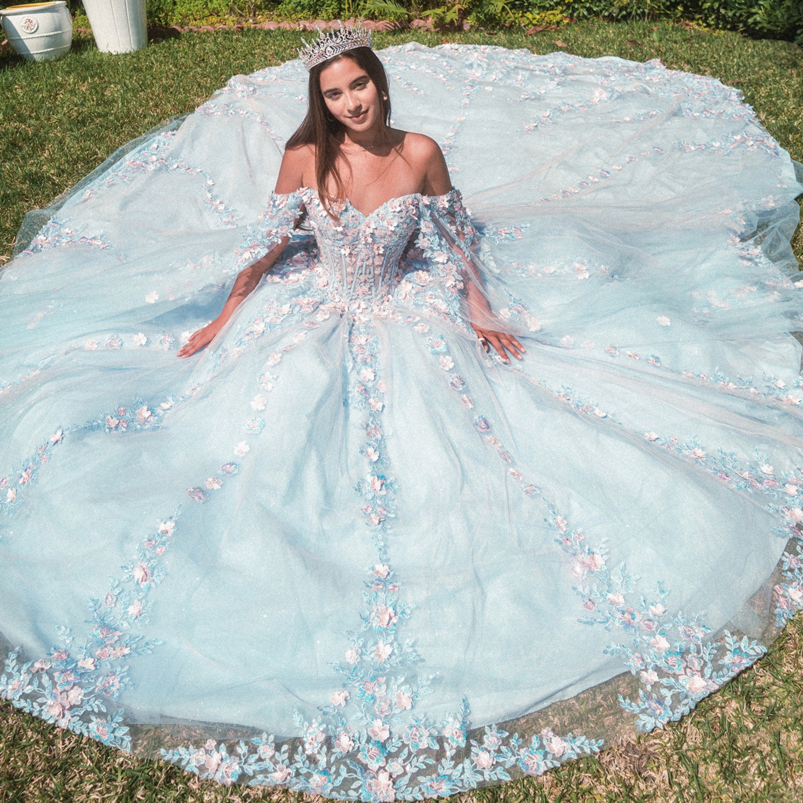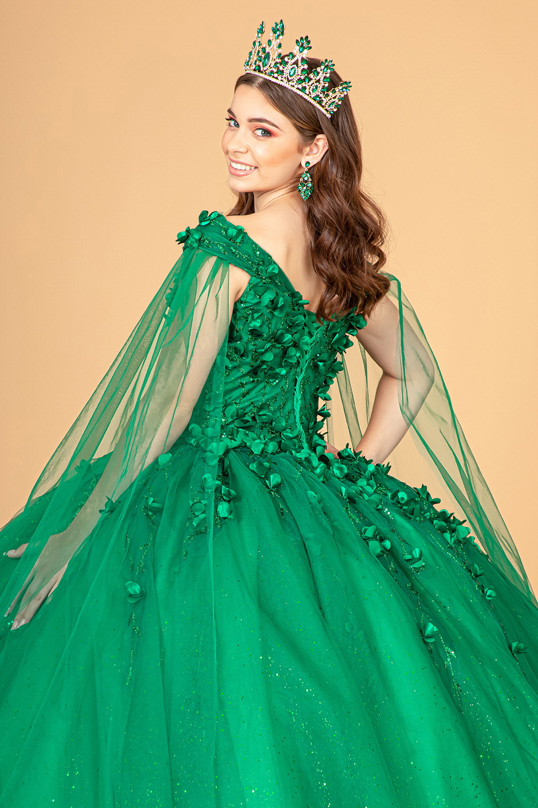3D Floral Applique Glitter Mesh Quinceanera Dress Detachable Cape Sleeve GLGL1974