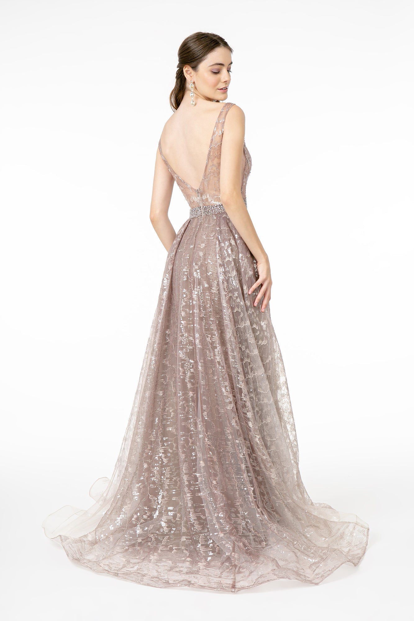 Embroidered Lace Glitter Illusion V-Neck Long Prom Dress