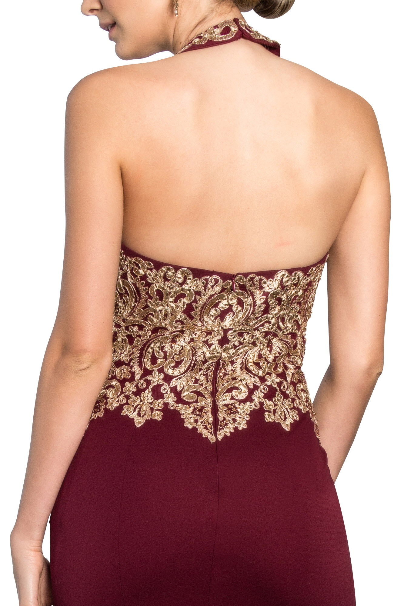 Embroidered Neck Halter Jersey Long Dress with Open Back GLGL2231