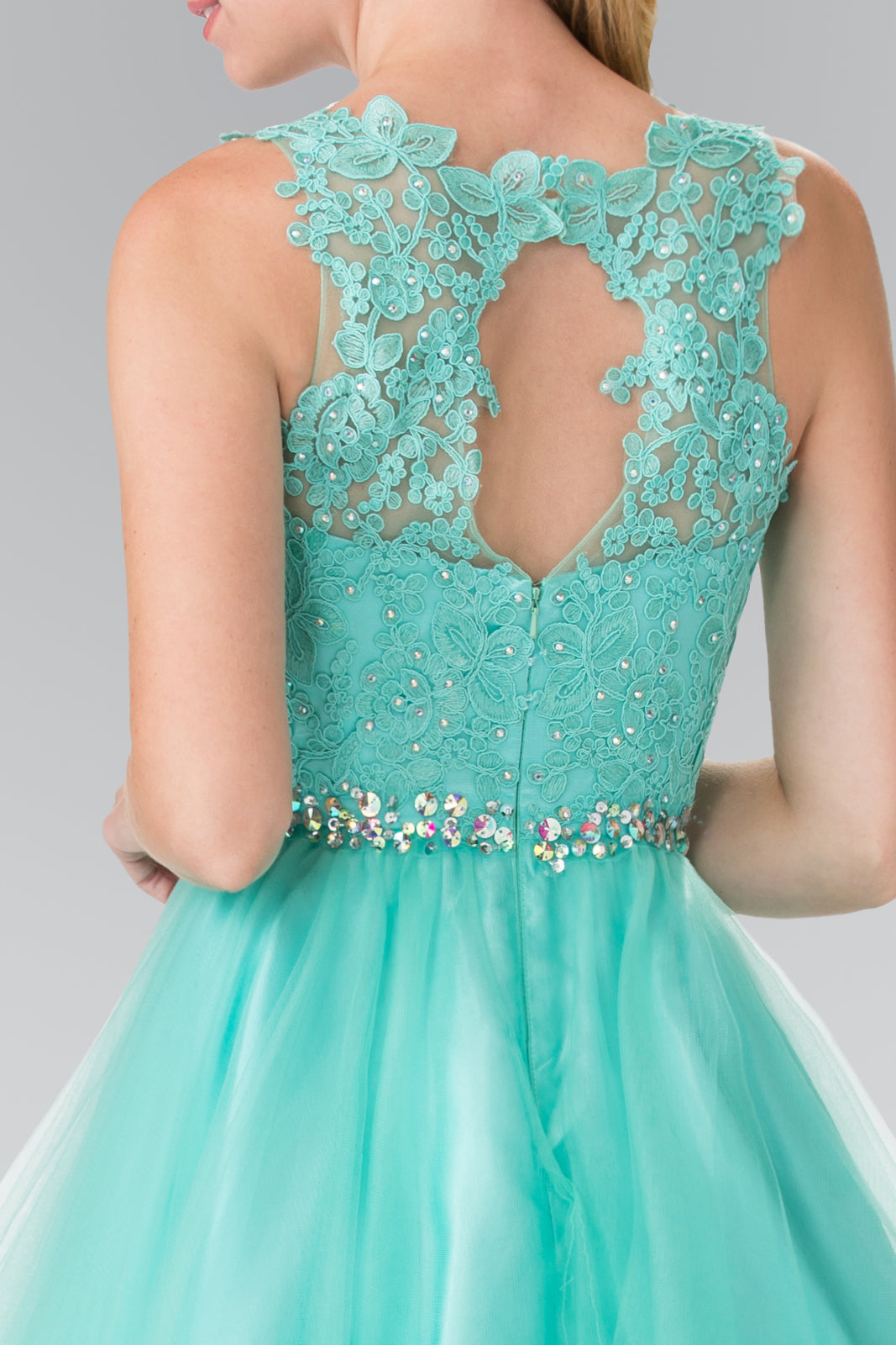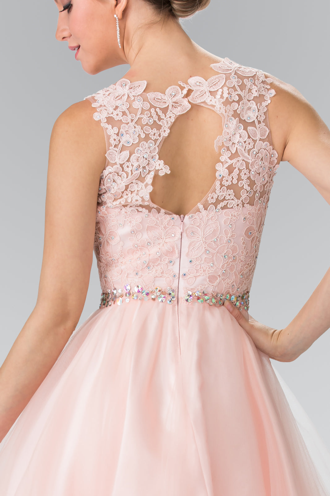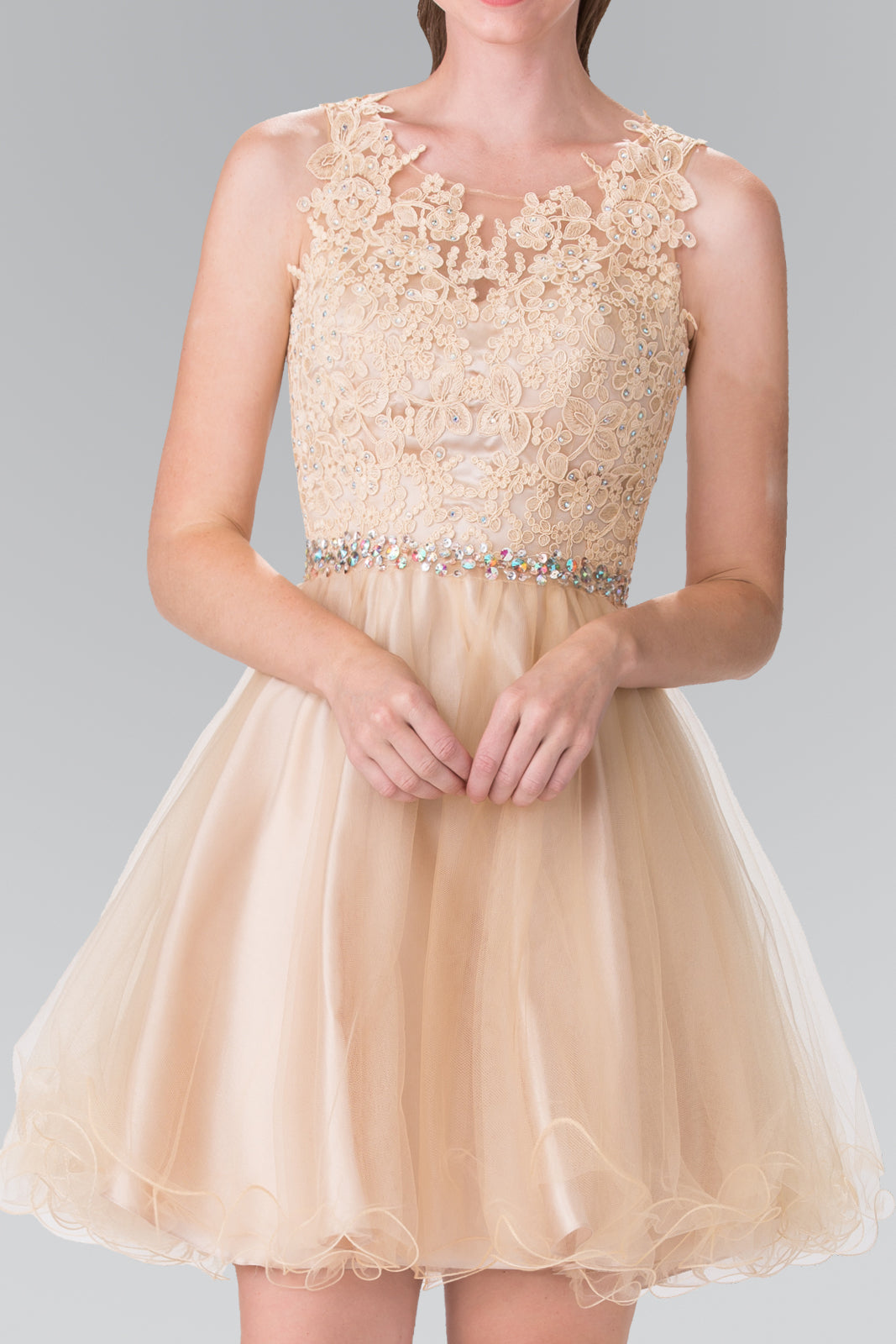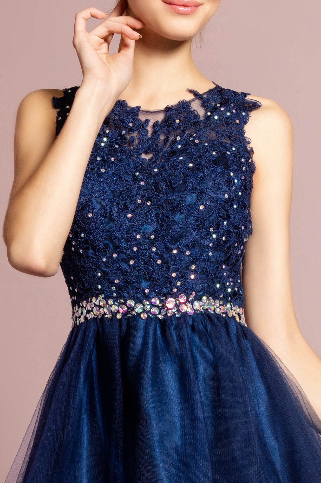 Lace Illusion Top A-line Short Dress with Beaded Waist GLGS2375
