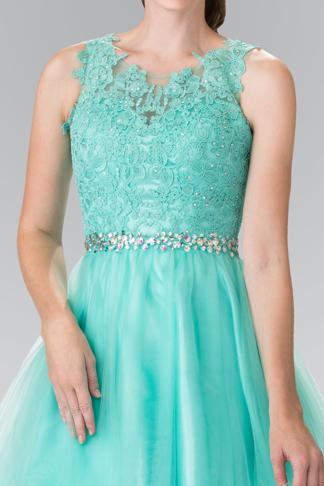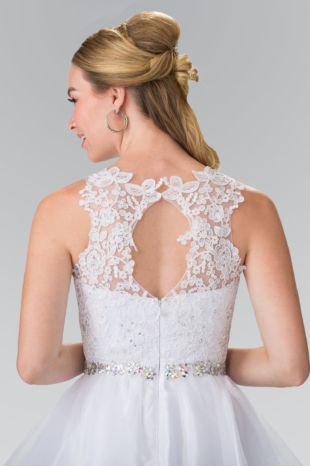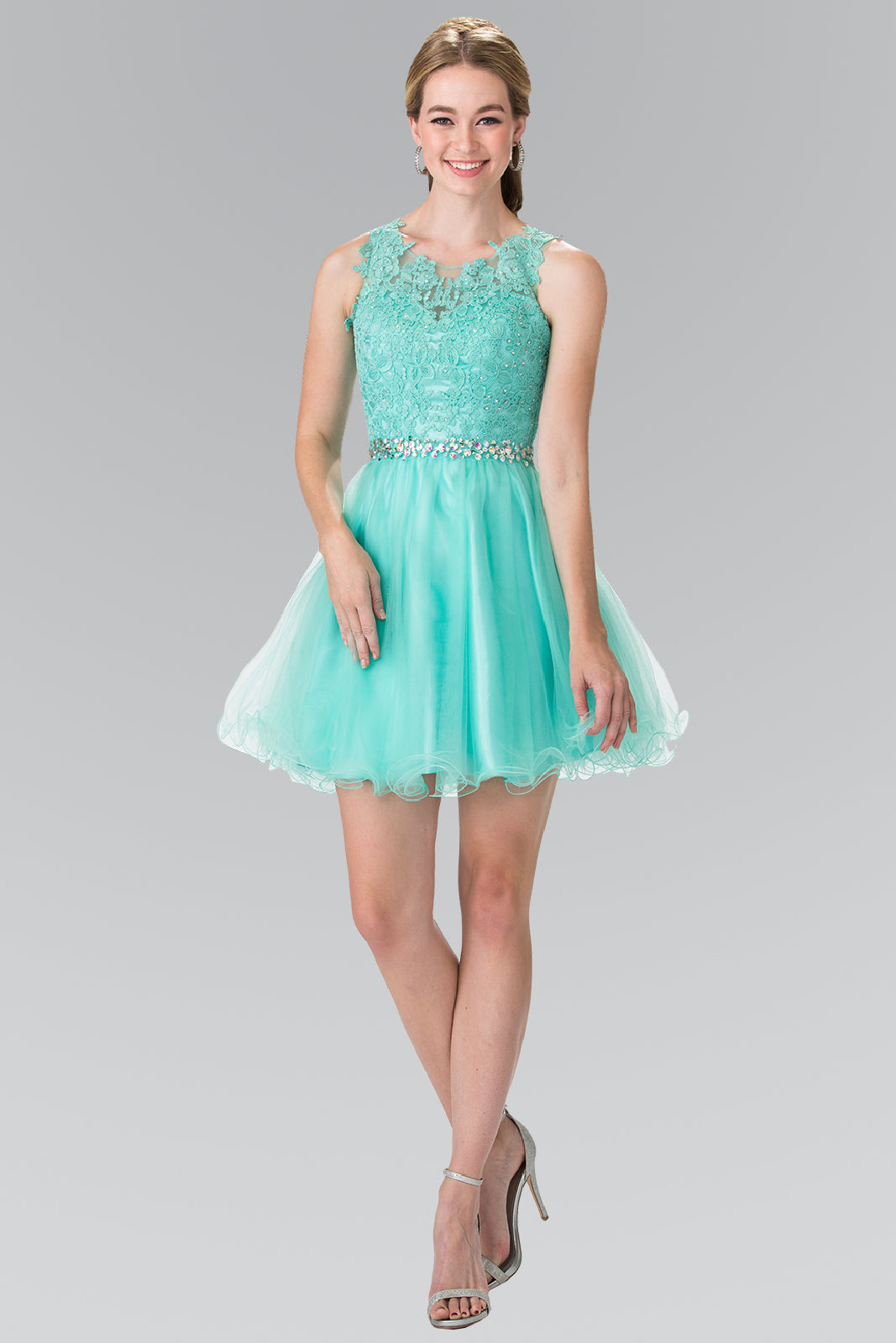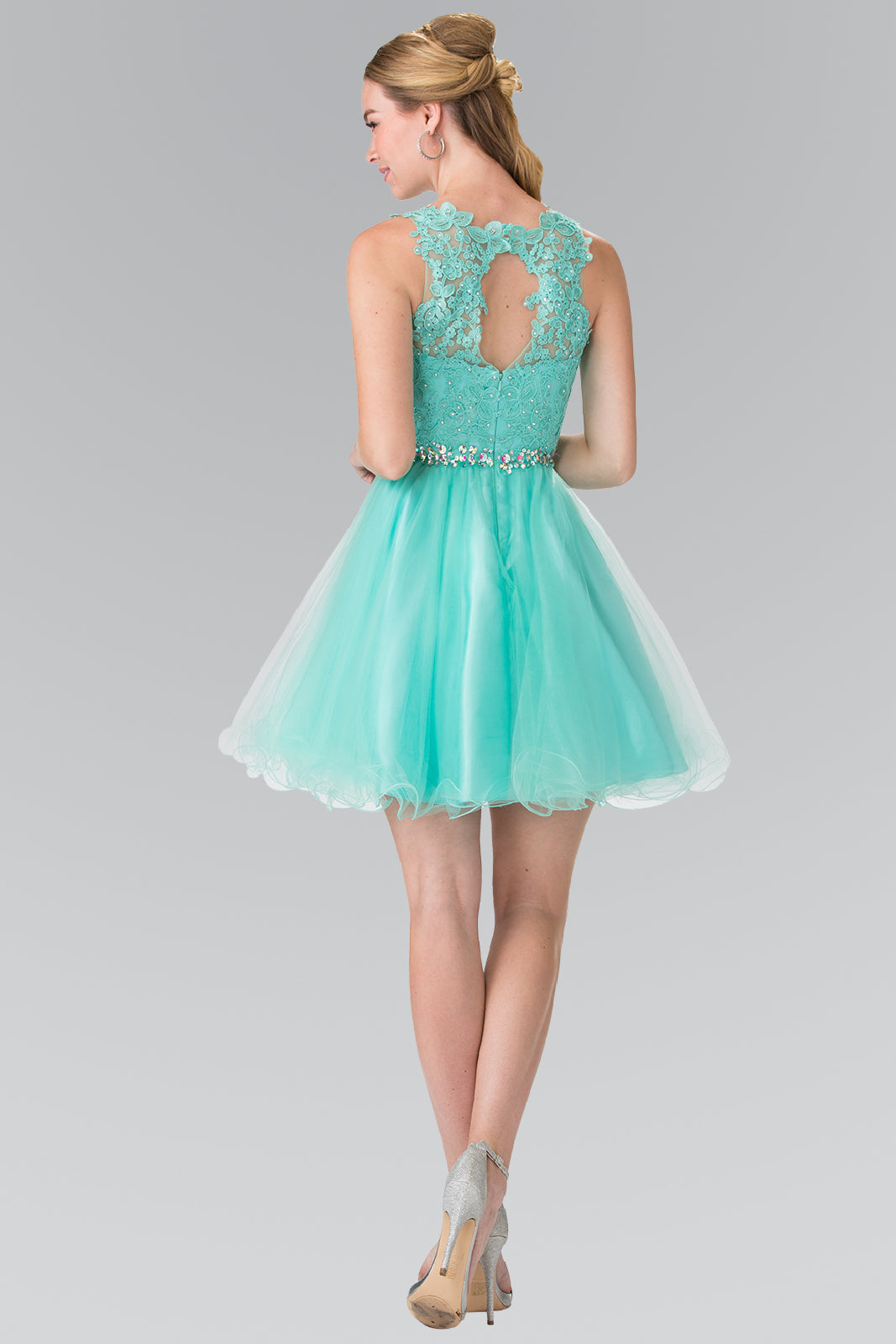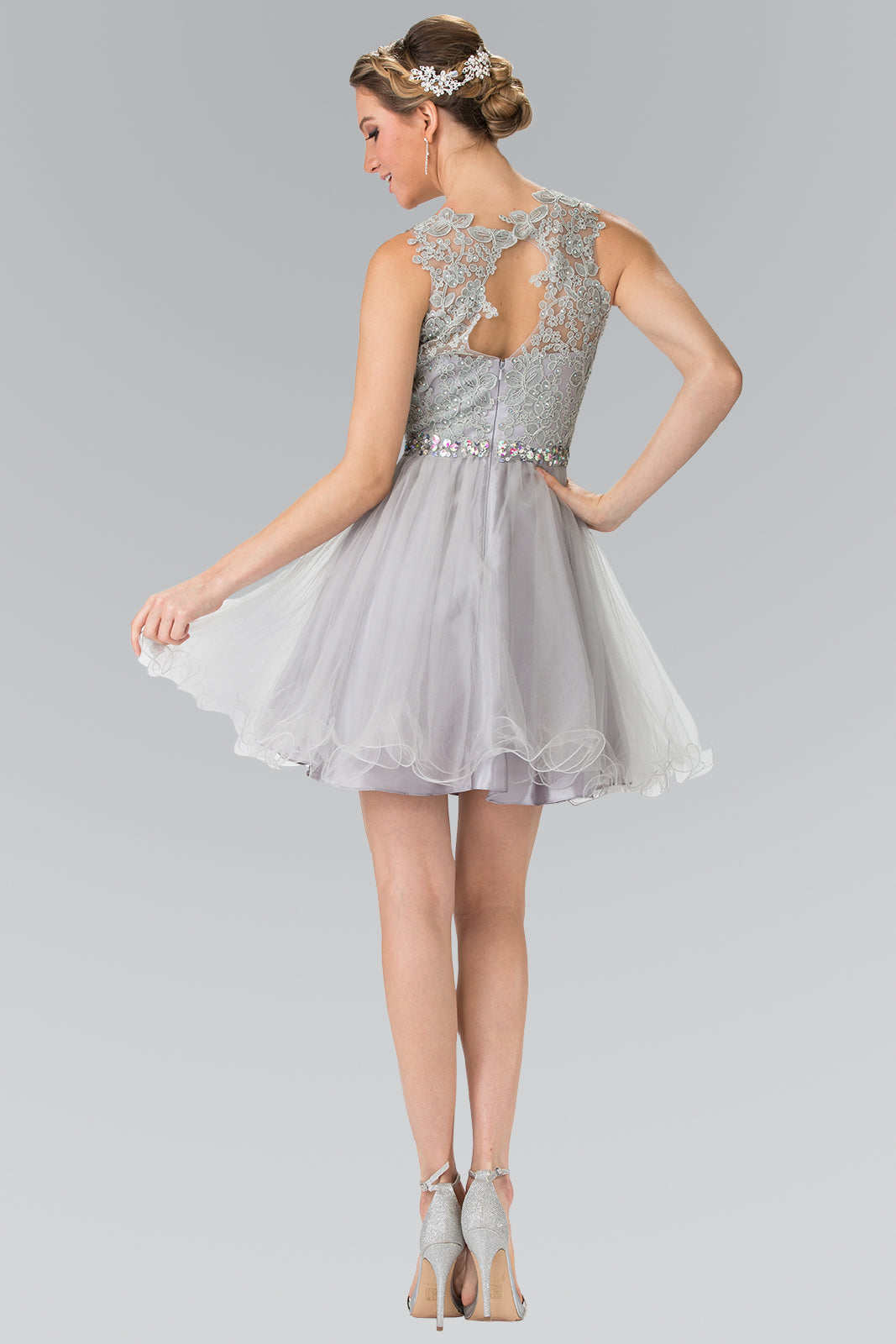 Lace Illusion Top A-line Short Dress with Beaded Waist GLGS2375