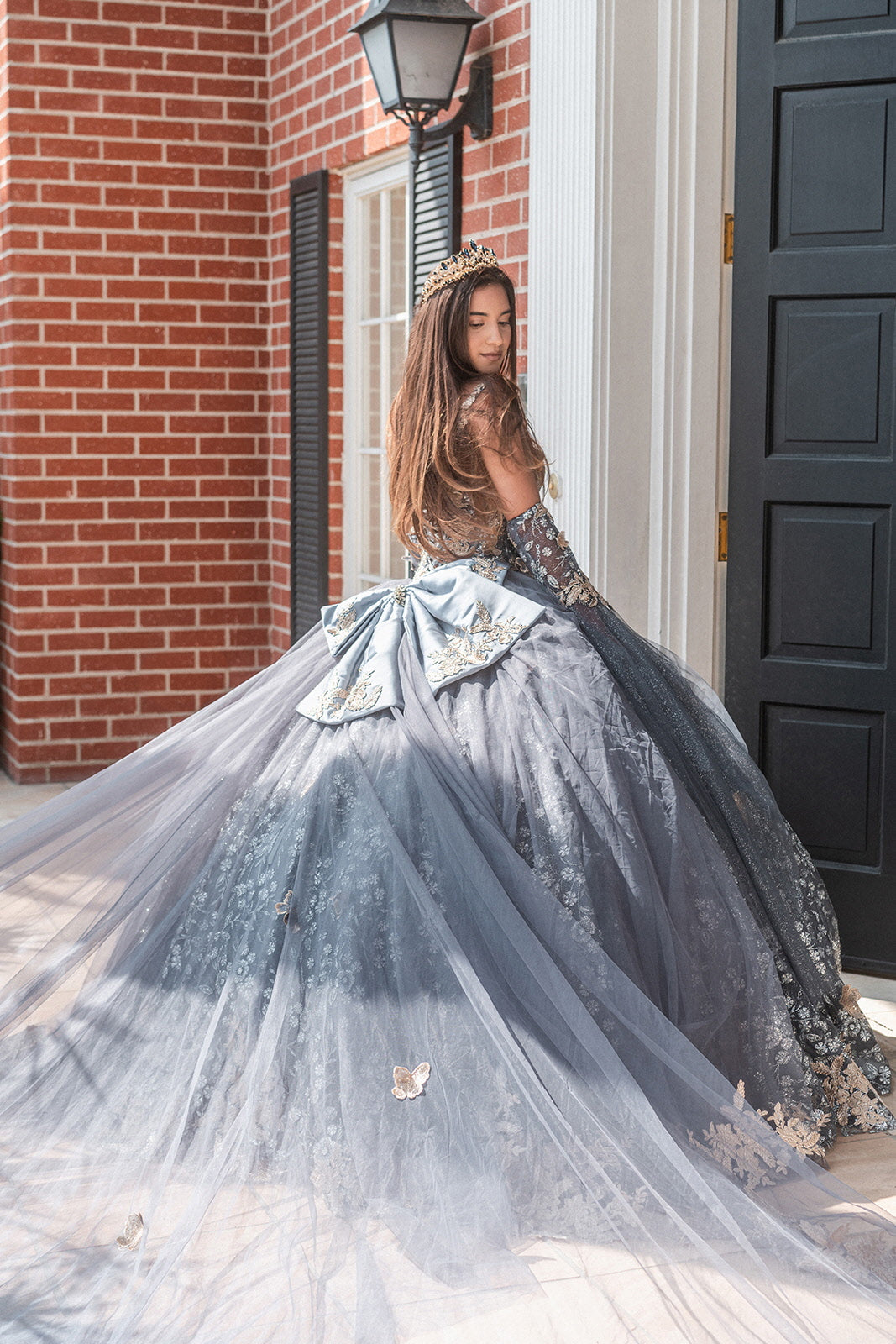 Mesh Long Sleeves Quinceanera Dress Detachable Ribbon and Mini Bag GLGL3071