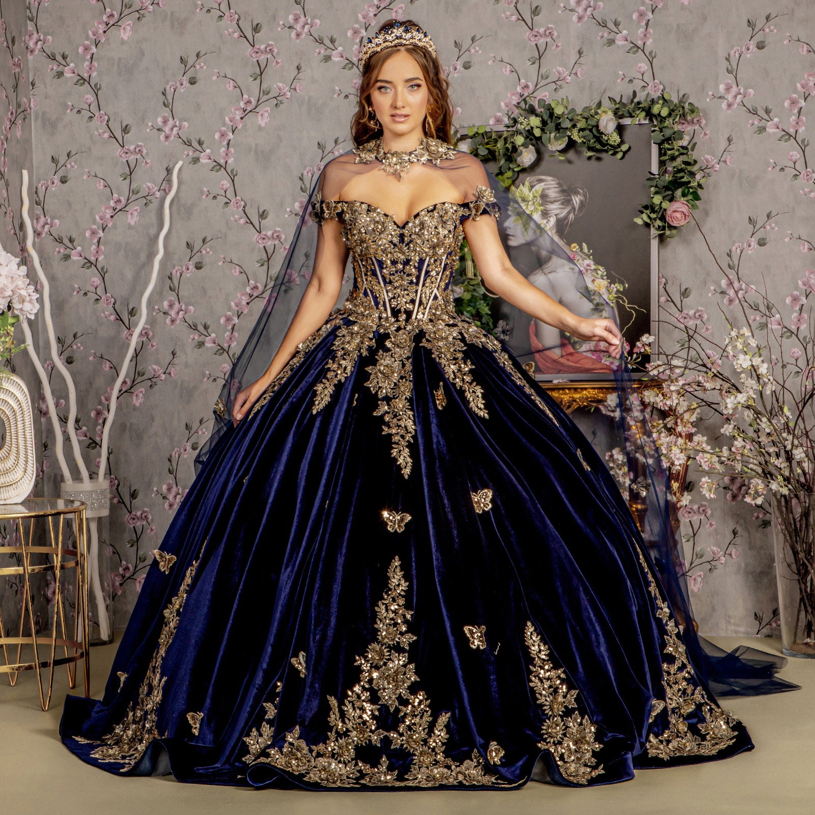 Metallic Embroidery Jewel Velvet Ball Gown Long Mesh Cape GLGL3471