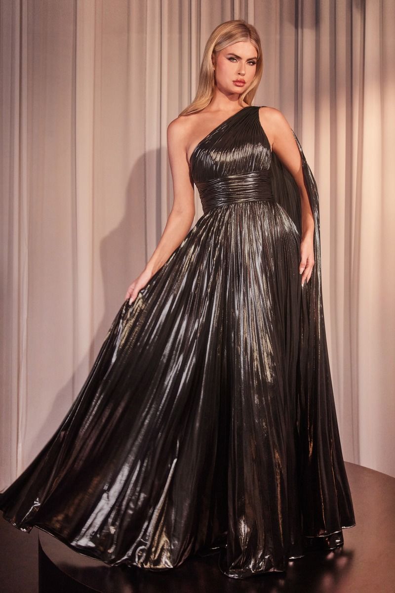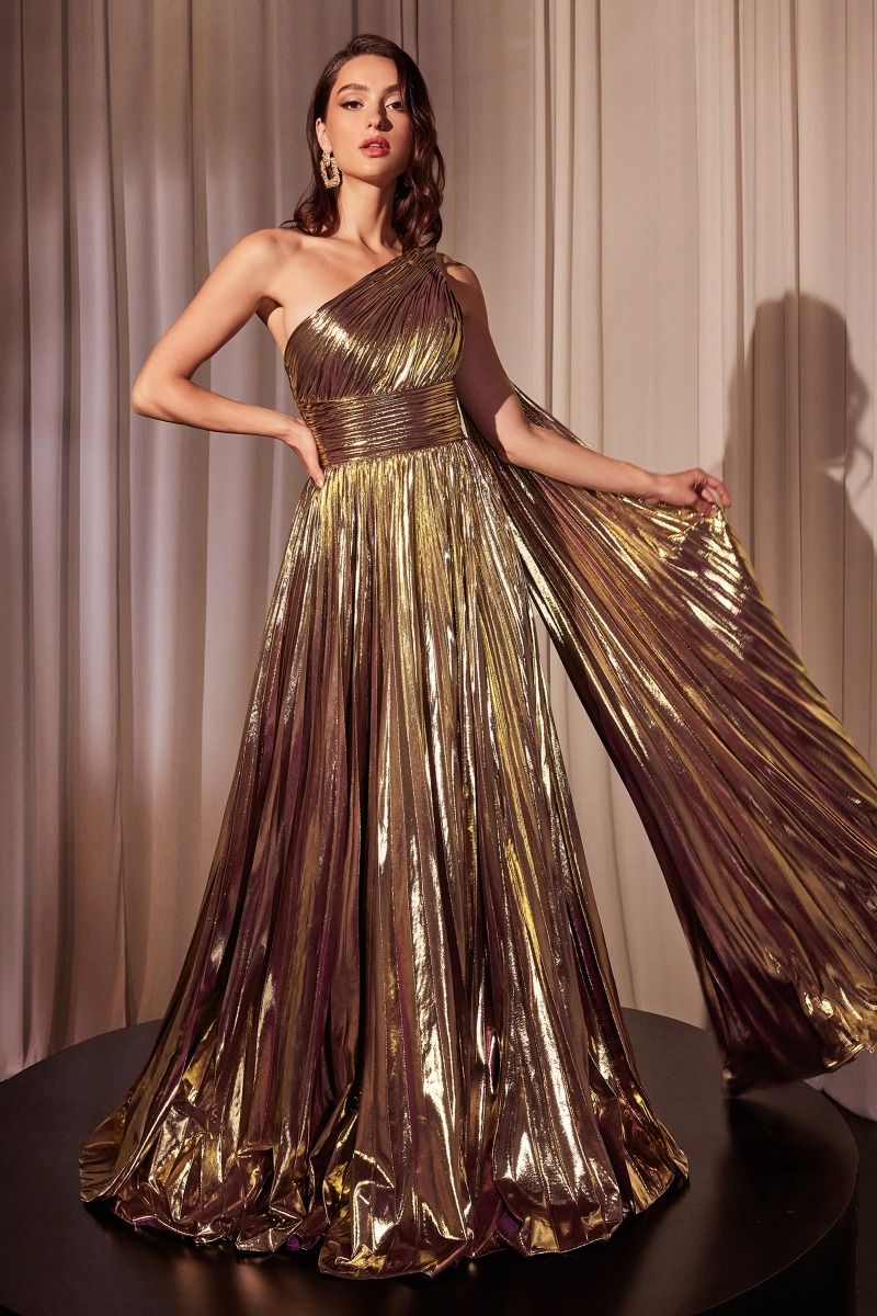 Metallic Gold Pleated One-Shoulder Evening Gown – Shimmering Formal Dress with Draped Cape