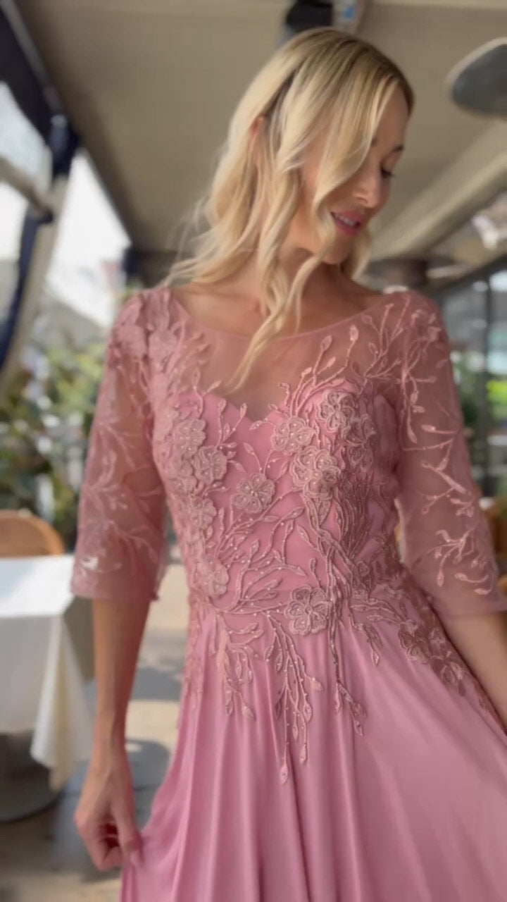 Bead and Lace Embellished Chiffon Long Dress with Sheer Bodice GLGL2065