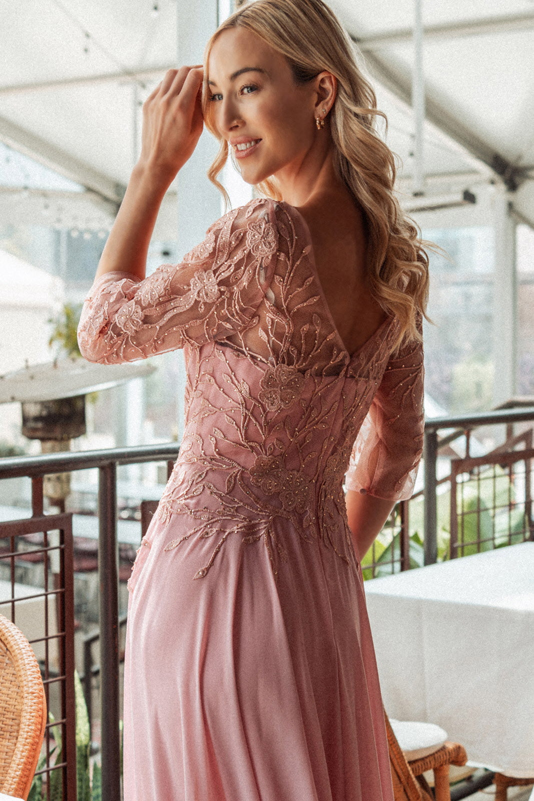 Bead Embroidery Sheer Neckline V-back Chiffon A-line Long Dress GLGL3445