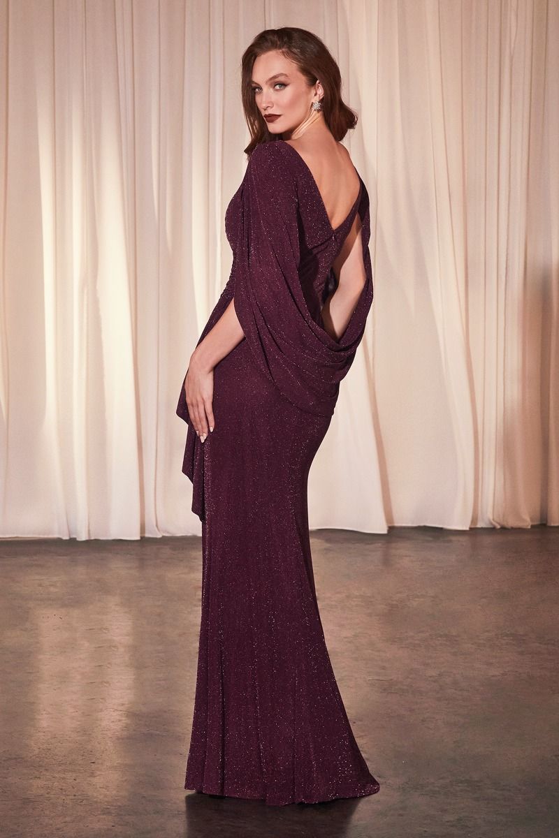 Plum Long Sleeve Glitter Gown with Draped Cape and Front Slit