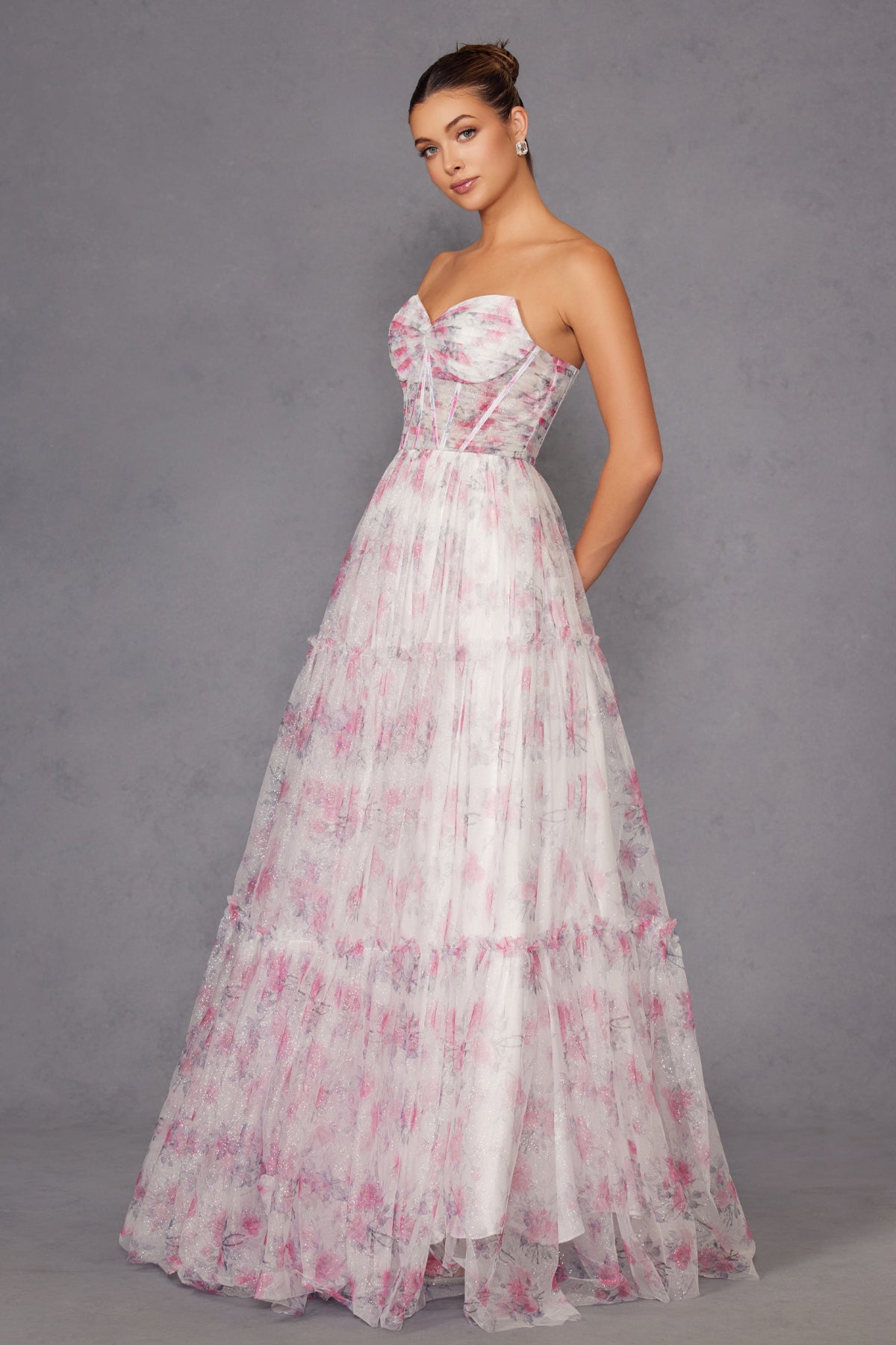 PROM A-LINE FLORAL EMBELLISHED DRESS W/ SHEER BODICE SEQUINS & LACE UP BACK