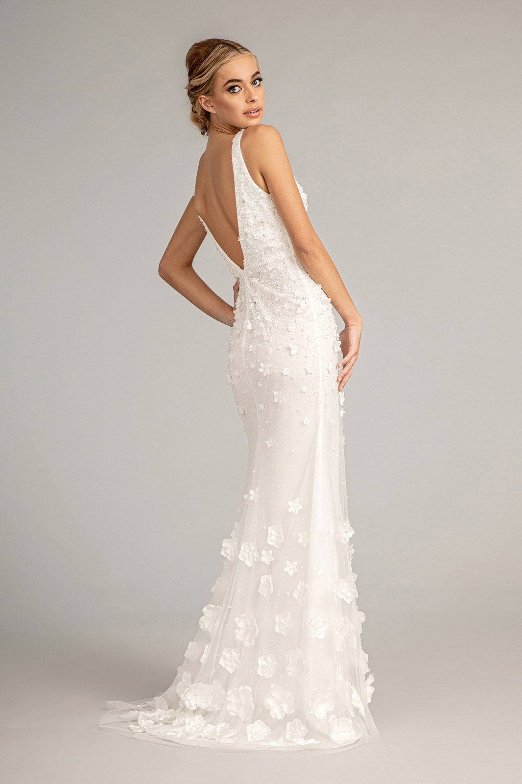 Rhinestone Embellished Mesh Mermaid Dress 3-D Flower and Detached Layer GLGL3011