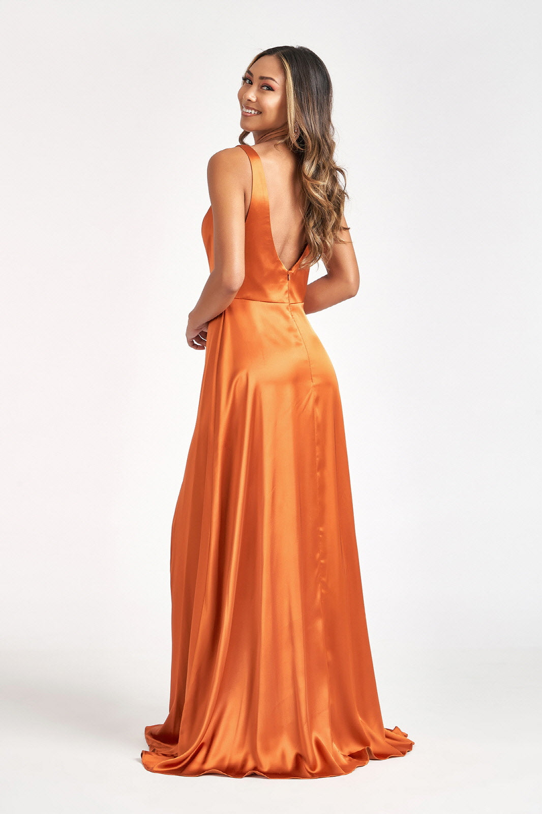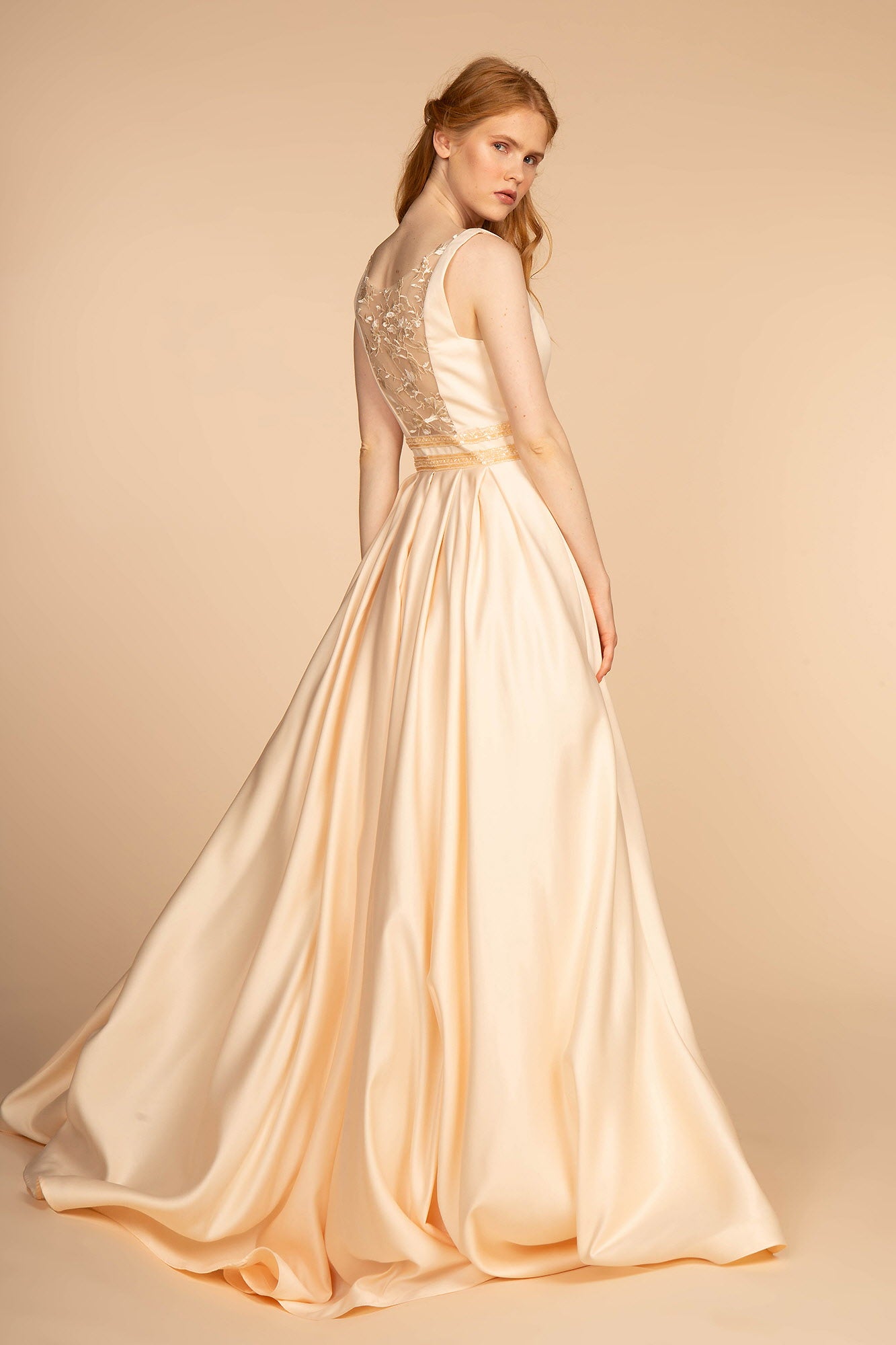 Satin V-Neck Sheer Side A-Line Long Dress GLGL1992