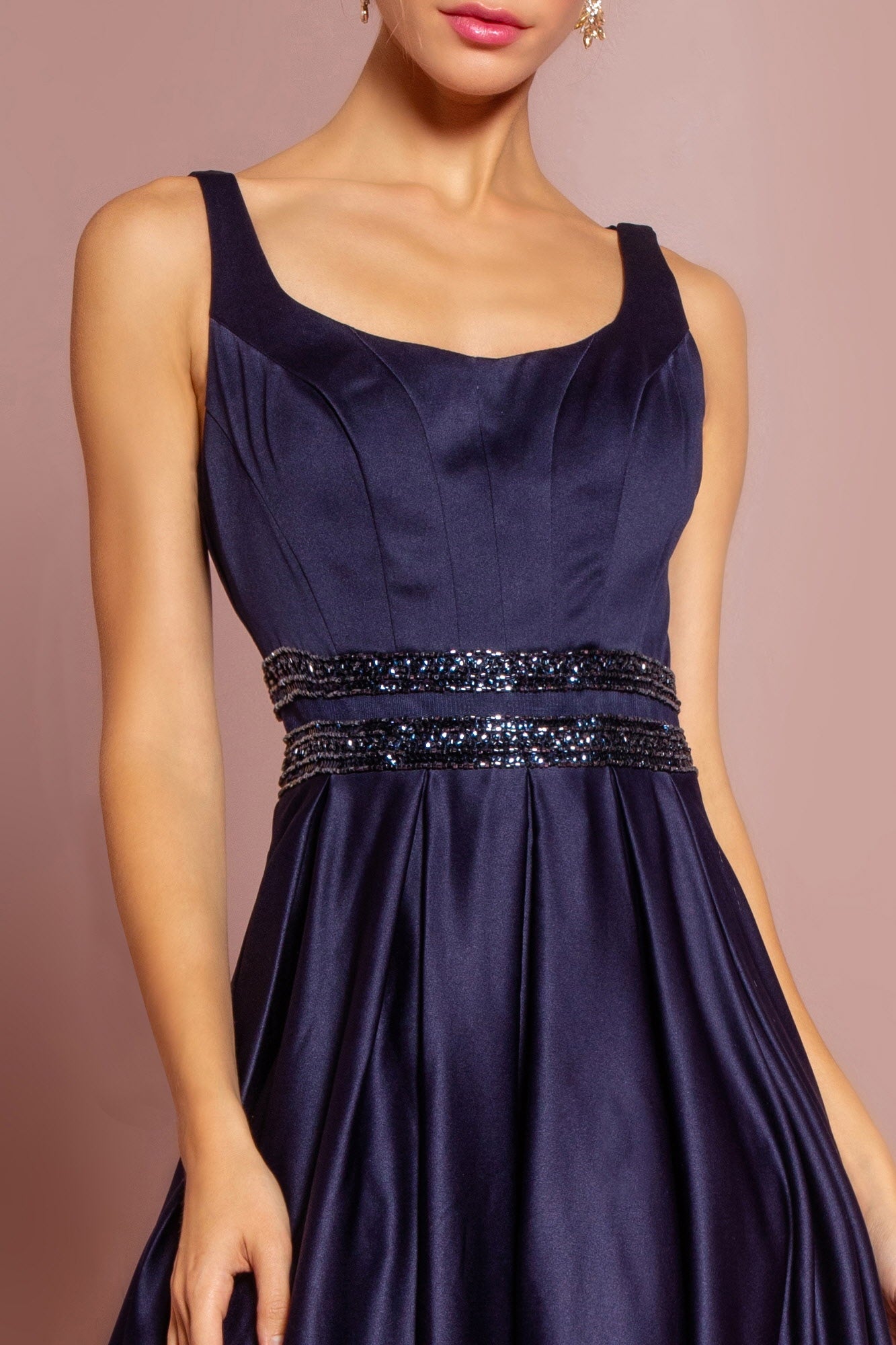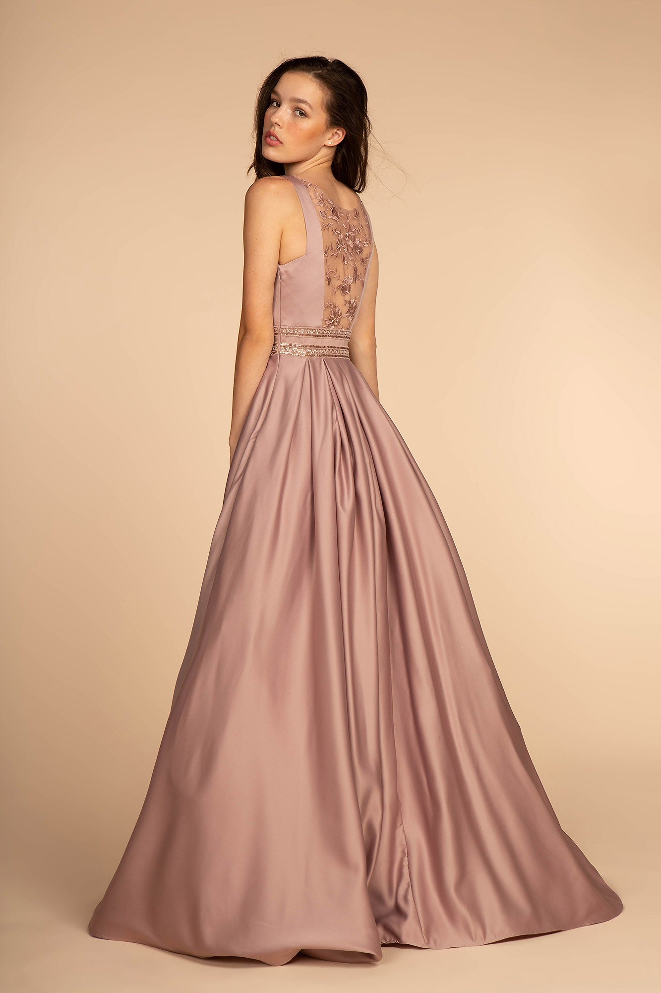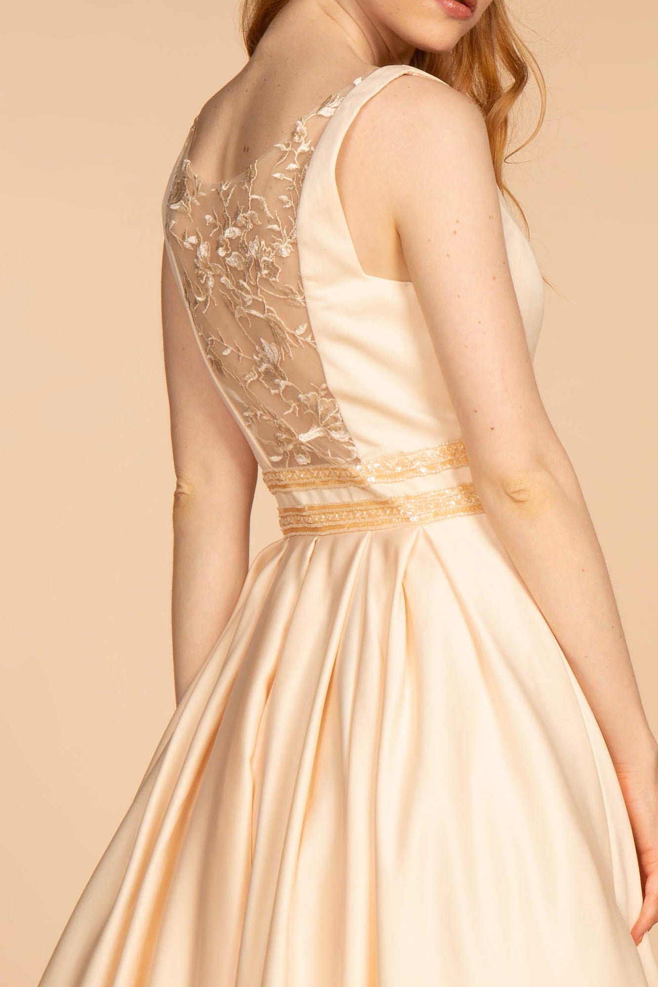 Scoop-Neck Satin A-Line Dress with Sheer Back GLGL2531