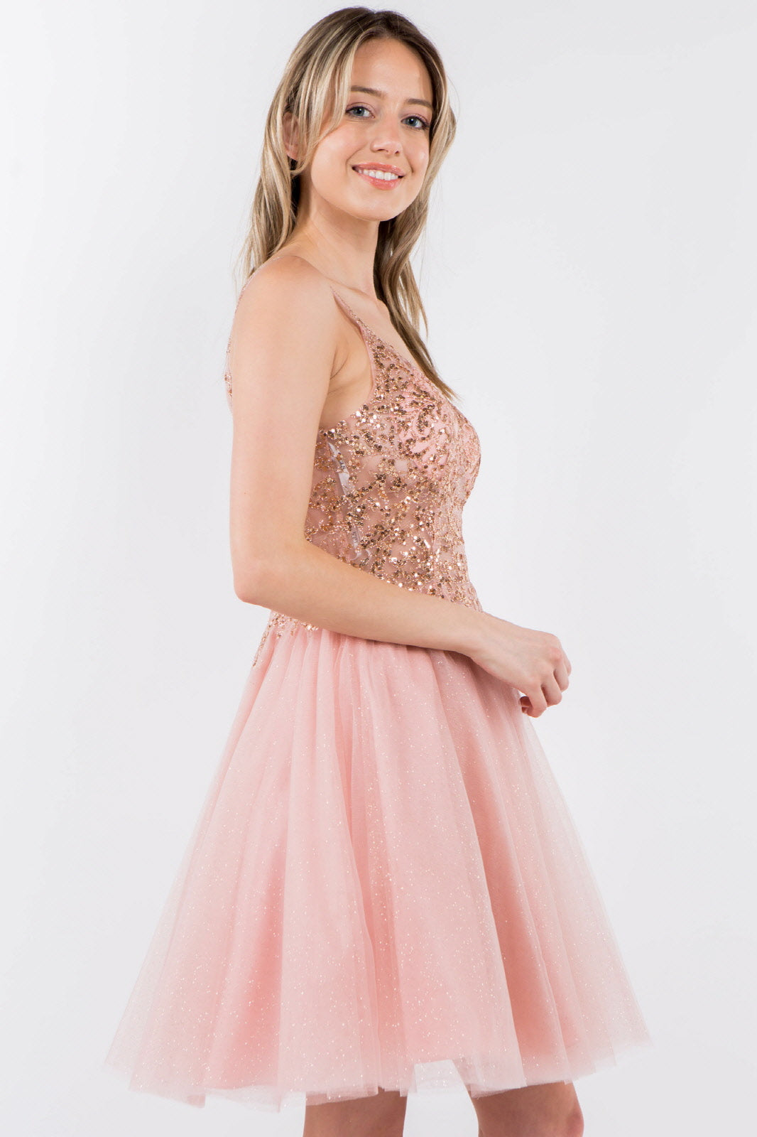 Sequin and Glitter Embellished Sheer Bodice V-Neck Short Dress GLGS1967