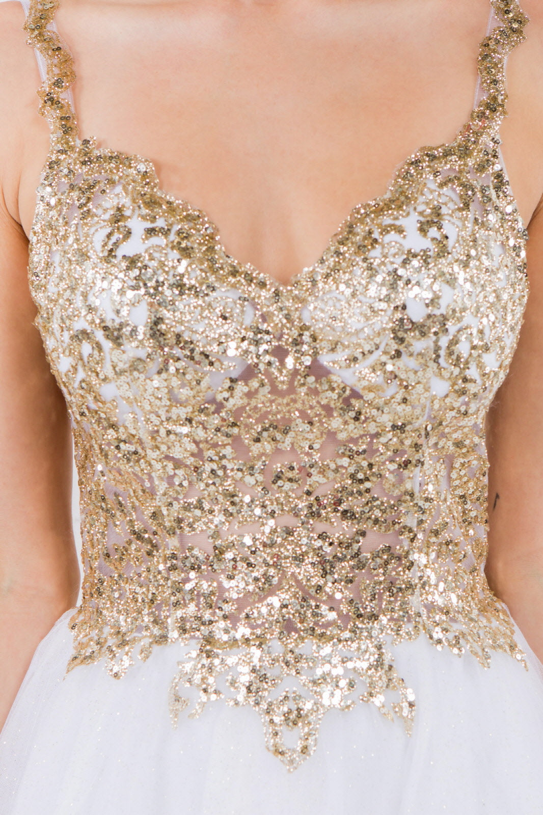 SEQUIN & FEATHER STRAPLESS WHITE GOWN CDCH147W