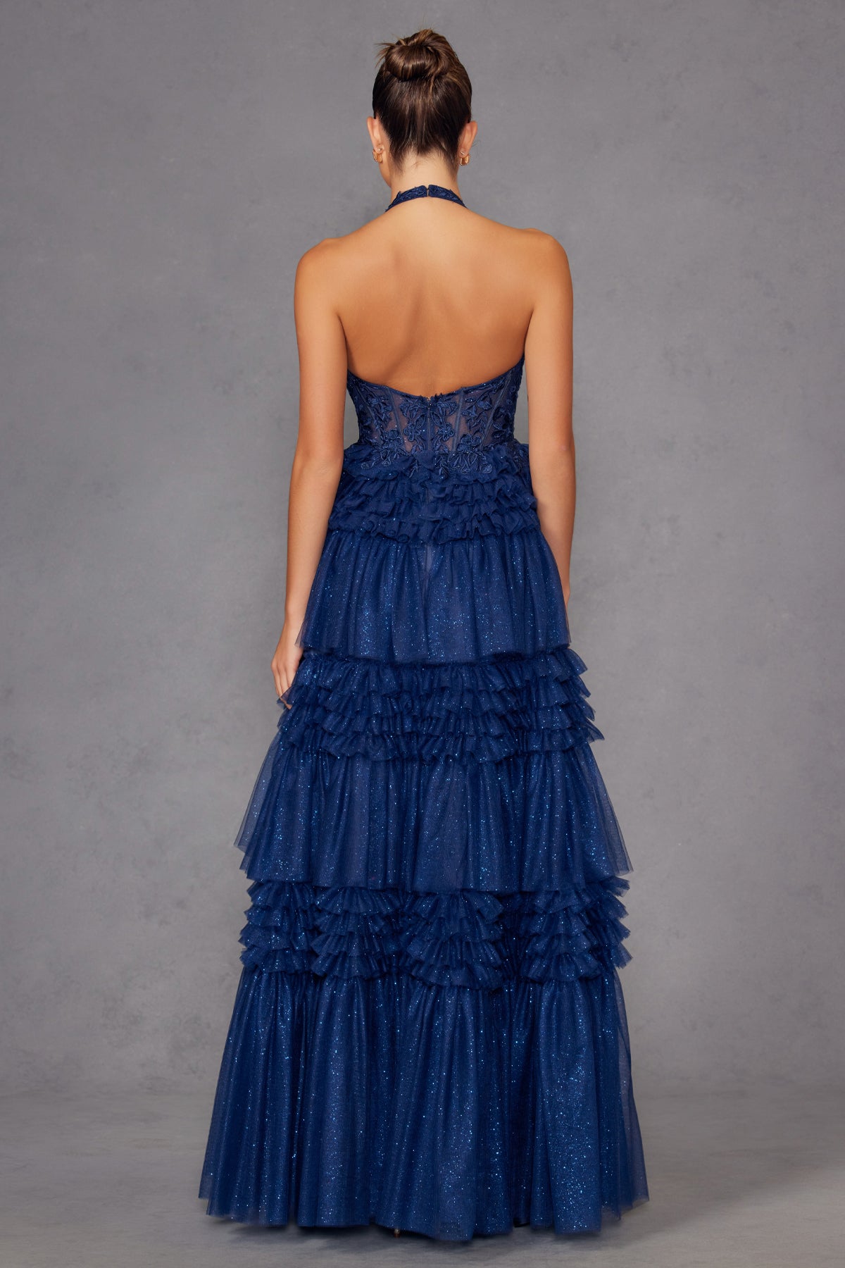 Sequin Corset Gown with Tiered Tulle Skirt – Plunging Slit Formal Dress JT2556S