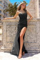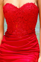 Turn heads with this stunning dress featuring intricate embroidery and a flattering bustier-style bodice. Its high slit adds a touch of glamour, while the lace-up back creates a figure-hugging fit.