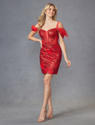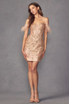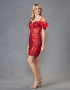 Glitter Illusion Deep V-Neck Off Shoulder Feathered Short Cocktail Dress