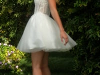 Dusty Blue, Gold, and Blush – Make your twirl unforgettable in this sweet and sparkly short dress, featuring a boned corset-style bodice, layered glitter tulle skirt, and delicate spaghetti straps. The fitted top and voluminous skirt create a charming A-line silhouette, perfect for homecoming, birthday parties, or any semi-formal event where you want to shine.