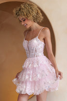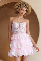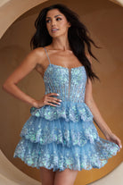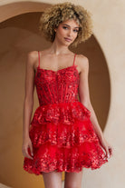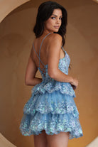 Step into charm with our Floral Tiered Ruffle Short Dress, a head-turning piece perfect for prom, homecoming, or any special event. Featuring a structured illusion corset bodice with thin adjustable straps, this short dress is beautifully adorned with shimmering floral embroidery. The tiered ruffle skirt adds playful volume and movement, giving it a youthful yet sophisticated feel. Available in both vibrant red and dreamy pastel blue, this dress is your go-to for effortless glamour with a touch of whimsy.