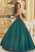 Gorgeous gown boasts a stunning beaded applique design, featuring a strapless illusion corset and a flowing, floor-length skirt. The bodice is crafted in a sweetheart style, and the back is beautifully open with a lace-up closure.