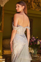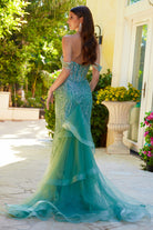 Covered in sparkling green sequins that catch the light from every angle, the fitted silhouette flares beautifully at the knees into a flowy tulle mermaid hem, creating drama and movement. The delicate off-the-shoulder tulle drapes add a romantic, whimsical finish that enhances the ethereal vibe of the dress.