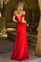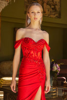 Red Off-Shoulder Sheer Corset Gown with Beading and Slit