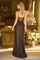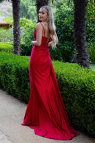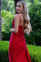 A red-hot showstopper, this gown features a sequined corset top, off-shoulder neckline, and a dramatic slit. Designed to turn heads at any evening affair.
